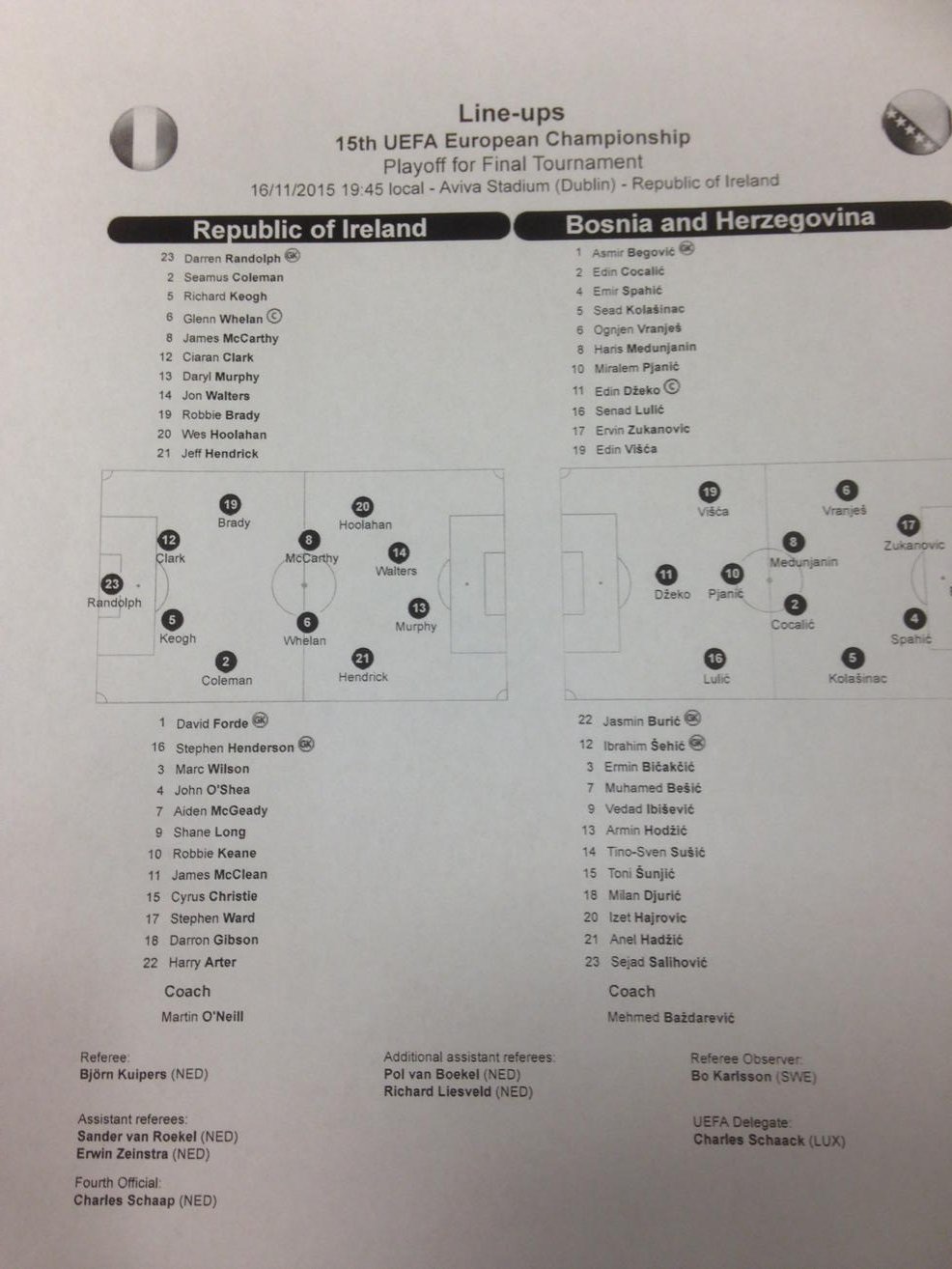 Republic of Ireland XI: Randolph, Coleman, Keogh, Clark, Brady, Whelan, McCarthy, Hendrick, Hoolahan, Walters, Murphy.